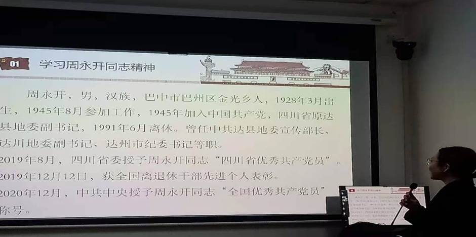 为了更好地开展党员民主评议、批评与自我批评,支部组织学习了周永开同志的先进事迹与精神。来自支部第三党小组的侯茜蓉同志代表第三党小组对周永开同志的先进事迹与精神进行了介绍。侯茜蓉同志主要从周永开同志的工作简历、获得的荣誉称号以及先进事迹等方面出发,带领大家一同学习周永开精神,号召大家向先进典型看齐,全心全意为人民服务,为党和人民奉献一生,为祖国的发展贡献力量。