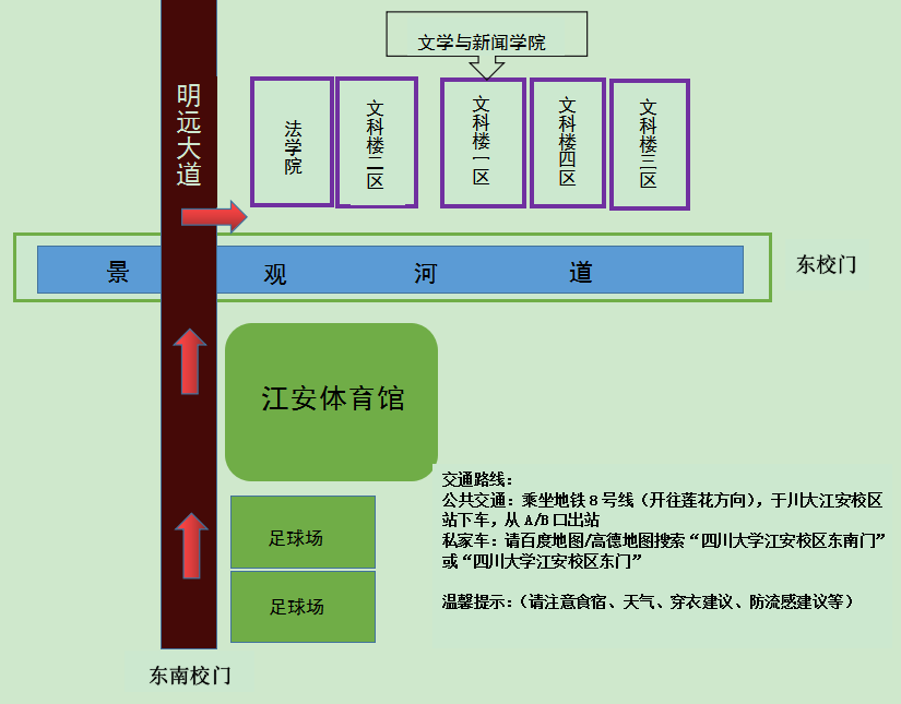 校外考生可乘坐成都地铁8号线在川大江安校区站下车,从A口或B口出站,到达滚球app官网江安校区东南门;也可乘坐私家车导航至滚球app官网江安校区东门或滚球app官网江安校区东南门(车辆不入校)。