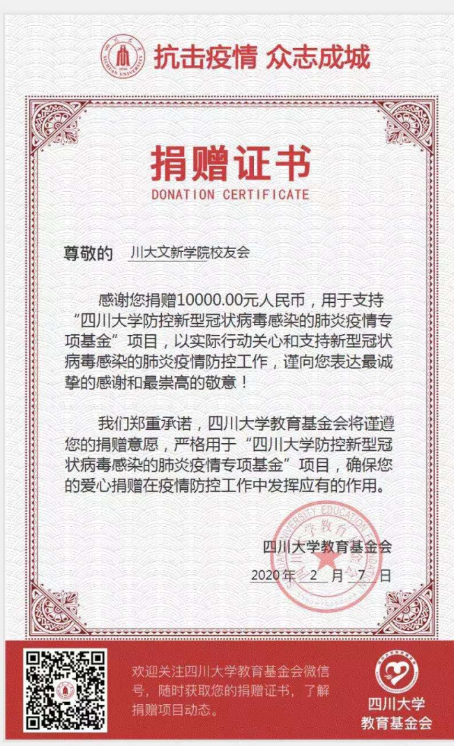 疫情发生后,文新校友积极响应国家号召,踊跃参与疫情抗击工作。2月5日经滚球app官网文新学院校友会秘书处提议,报何世平会长审批,决定代表滚球app官网文新学院全国校友,向滚球app官网防控新冠肺炎专项基金捐赠人民币10000元。