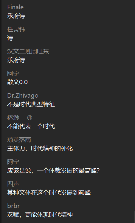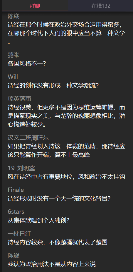 罗鹭老师的课程《中华文化(文学篇)》采用录制视频+学生讨论的方式,提前录制好视频,有效避免了直播课程的断线、卡顿、模糊等情况,最大程度地为同学们学习提供了方便。学院巡课时,罗老师及助教有效利用qq群和学生进行讨论,保证了每个人都能发声,每个观点都能被听见,同时,不同观点还可以互相碰撞思想的火花。在老师抛出问题时,同学们的回答非常踊跃,且在回答中能够做到互相交流讨论。虽然同学们来自不同的学院不同的年级,对文学的热爱却一以贯之。《诗经》作为五经之首沉淀了数千年的魅力,良好的教学环境和充实的课堂内容更催化了热烈的讨论气氛,可称得上“百家争鸣”。