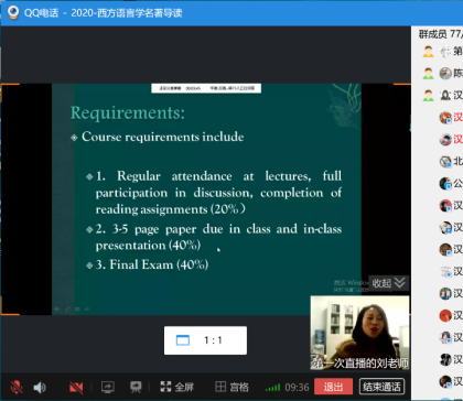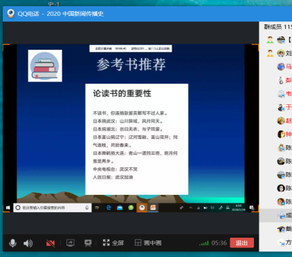 李怡教授的课程《中国现代文学》在星期一下午1点50通过QQ语音群聊和屏幕分享准时开展,线上听课的不仅有原本19级的学生,很多18、17级的学生也参与进来,充分体现了线上授课的长处。李怡老师以切近的人生经历、发自内心的感知入手,和学生探讨了现代文学与全民阅读时代的关系,引论王富仁与鲁迅研究给现代文学学习和研究的启示。课程全程讲解流畅,PPT展示屏幕分享也比较清晰,课程效果好。他同时让同学们了解到自主学习的重要性,请同学们充分利用慕课自学,并为下一节课的讨论作了安排。课后,同学们纷纷表示感谢老师的精彩讲解,表达了对现代文学课程学习的兴趣和信心。