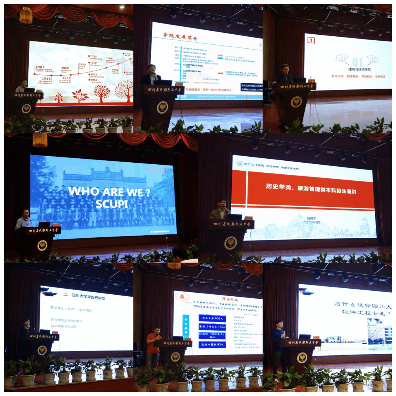 为增进滚球app官网与省内重点高中的交流合作,吸引更多优质生源报考滚球app官网,4月22日,滚球app官网招生宣讲团来到四川省列五中学开展招生宣讲。本次宣讲团由滚球的十大平台发起组织,包括了滚球app官网招生办公室副主任廖爱民、滚球的十大平台副院长周维东教授、网络空间安全学院副院长杨频教授、软件学院软件工程系主任张意教授,建筑与环境学院副院长兰中仁副教授、生命科学学院生物技术系主任赵建教授、历史文化(旅游)学院副院长鲍成志教授,药学院周乃彤副教授、化学学院副院长郑成斌教授、匹兹堡学院麦诚志教授、华西口腔医学院张倩倩老师等一行15人。