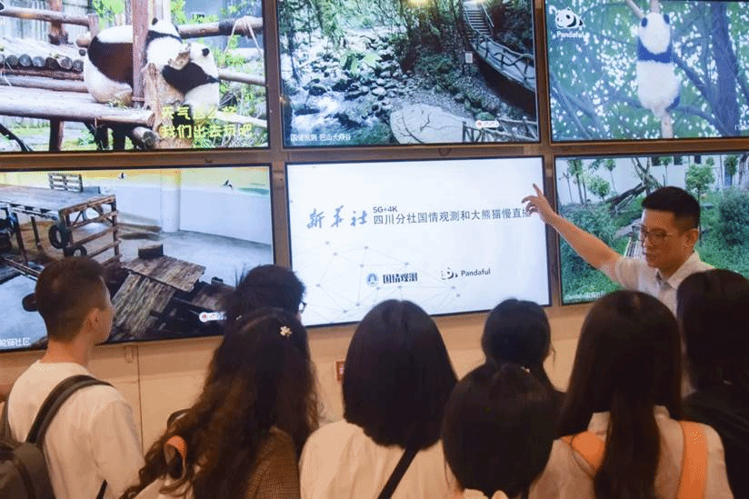 步入新华社四川分社社史陈列室之前,滚球app官网党员师生首先被新华社四川分社办公大楼一楼大厅里的12个显示屏吸引。新华社四川分社音视频部副主任、主任记者、滚球app官网2005级新闻系本科校友萧永航介绍说:“屏幕上正在播放的是新华社四川分社国情观测和大熊猫慢直播。其中,大熊猫慢直播是‘熊猫社区Pandaful’的重要运营内容之一,该社区每年生产200余条熊猫短视频。”萧永航副主任形象地将慢直播平台比作新华社的“厨房”,“它储存着大量原材料,需要之时可以即时进行选择与加工”。