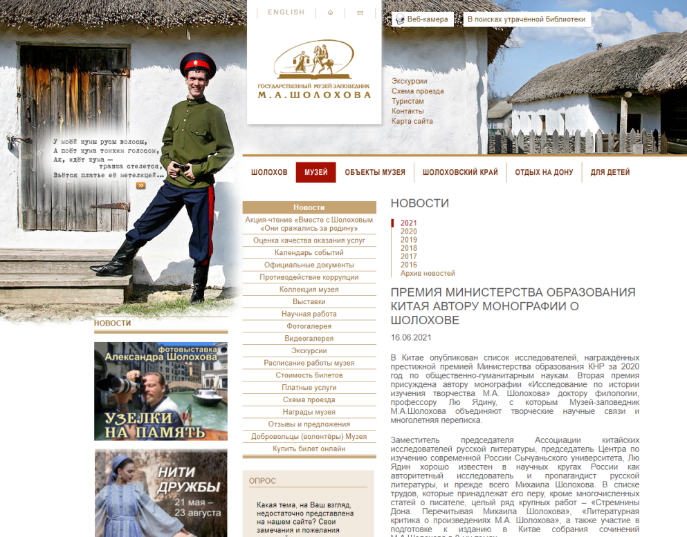 近日,俄罗斯国立肖洛霍夫故居博物院官网刊发题为《中国教育部授予肖洛霍夫研究者奖项》(ПремияМинистерстваобразованияКитаяавторумонографии о Шолохове)的新闻,详细介绍了滚球app官网刘亚丁教授关于肖洛霍夫的研究成果及其与俄方学界的交流经历,对其学术工作的意义予以高度评价。