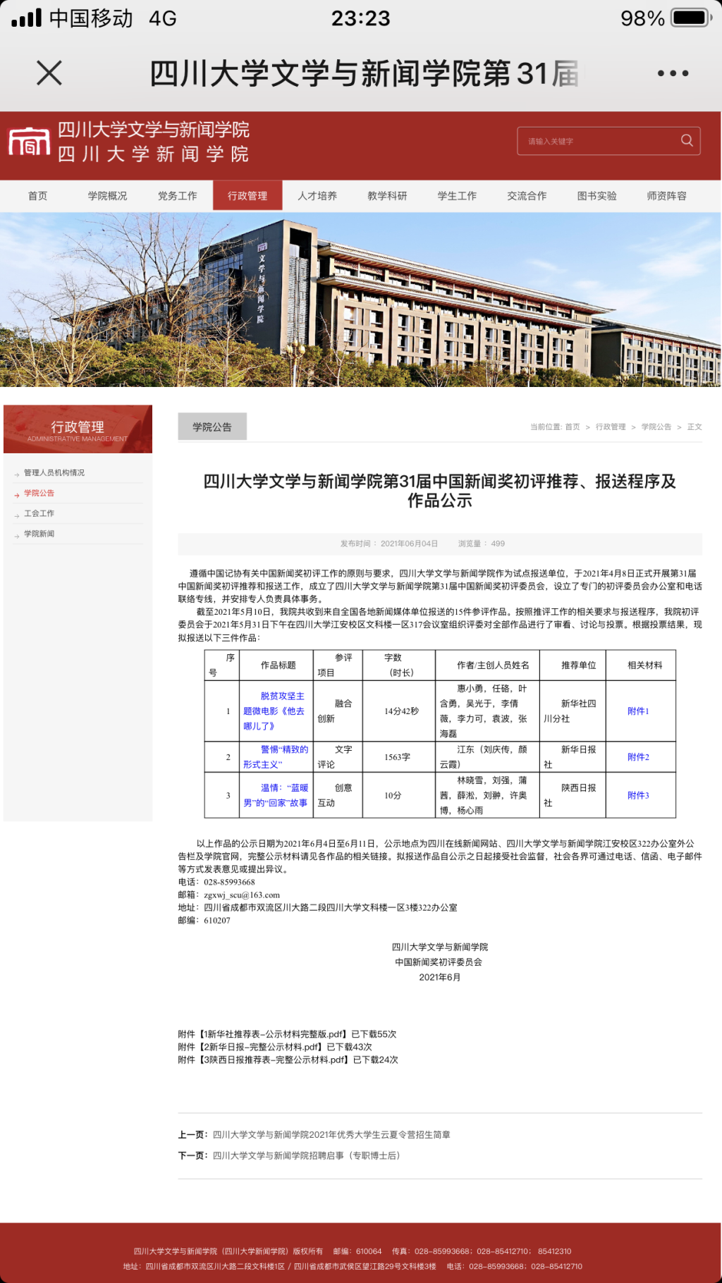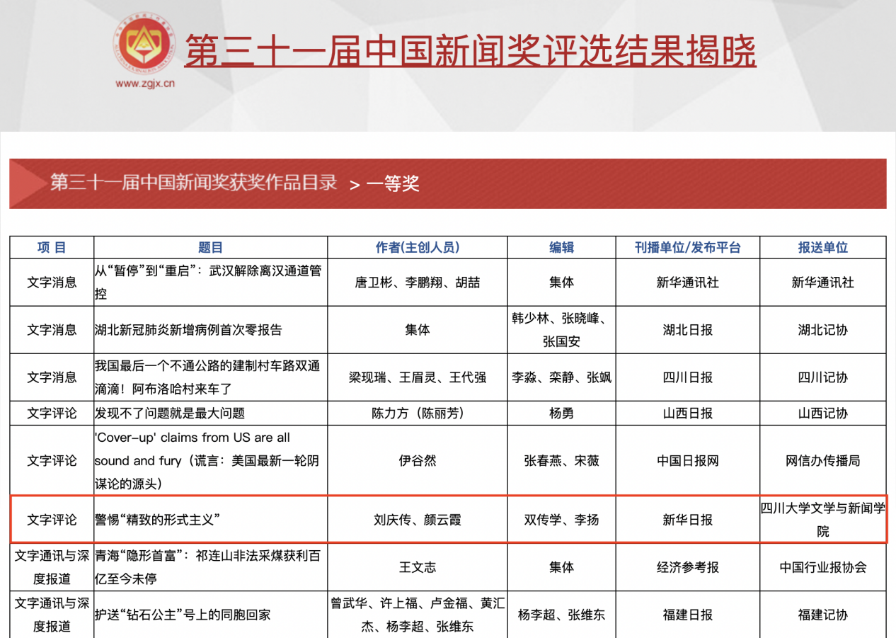 2021年11月7日,中华全国新闻工作者协会主办的第三十一届中国新闻奖评选结果揭晓,四川大学文学与新闻学院报送的新华日报作品《警惕“精致的形式主义”》喜获第三十一届中国新闻奖一等奖,是此届中国新闻奖一等奖中仅有的三篇文字评论之一。这是自2016年起担任试点报送单位以来,滚球app官网初评推评的作品第五次荣获中国新闻奖。