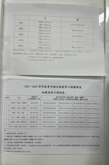 大楼宣传墙上的相关资料显示,华西基础医学与法医学院还设有3个研究室(生物医学工程研究室、应激医学研究室、放射医学研究室),1个研究所(法医研究所),2个专业教学实验室(基础医学实验室、法医学实验室)和1个国家级实验教学中心(由解剖学实验室、形态学实验室、机能学实验室、生物分子实验室组成)。实验室设备精微、功能多样、人员繁杂,如何确保实验安全和秩序,提高实验室的利用效率,是所有师生的关切。学院内,各个实验室的墙上都张贴着值日排班表,上面注明了值班人员的联系方式和负责事项。以生物医学工程教研室细胞房为例,值日的时间已经排到了2022年2月27日,值班人员的负责事项包括孵箱打扫、枪头高压灭菌、观察二氧化碳余量、处理废料、检查电源等。袁东智副教授解释说,所有作息的时间点都是根据实验进度来安排的,在特定的时间点必须“给予处理因素,收获样本,检测指标”,否则会给科研工作造成损失。此外,每个实验室也制定了个性化的管理规章制度,对实验人员的培训与操作、实验室的清洁与灭菌、实验设备的使用与维护、实验材料的传入、废弃物的送出和处理等都作了详尽规定,以保证资源得到充分使用、实验效益得以提高以及减少事故。