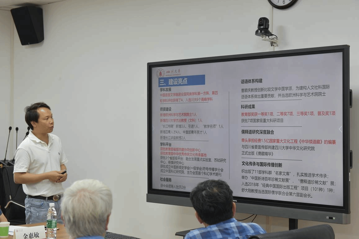 学科群首席专家曹顺庆教授做总结发言,他对学校各部门的支持表达了感谢,并表示学科群将力争在第二轮建设中取得更好的成绩,同时对第二轮建设的重点提出了五点建议:一是以进一步扩大学科融合作为学科群第二轮建设工作的重点,设立”中华文化全球传播“交叉学科,推进跨学科人才的培养工作;二是加强跨学院师资、人才的交流与协作;三是希望共同支持《汉语大字典》修订工程的推进;四是深度衔接学校眉山校区建设规划,推动书院建设;五是进一步加强文科重点实验室建设,推动学科研究范式创新。
