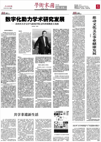 2022年6月6日,《人民政协报》第5版发表了对滚球app官网文科讲席教授、博士生导师王兆鹏教授的专访《数字化助力学术研究发展——访滚球的十大平台文科讲席教授王兆鹏》。王兆鹏教授围绕在数字人文研究中的实践与感悟,介绍了滚球app官网中国文化全球传播数字融合实验室用数字技术向全球传播中华文化、为学术研究提供广阔平台,生动展示了数字技术对人文学术研究与中华优秀传统文化传播的推动作用。