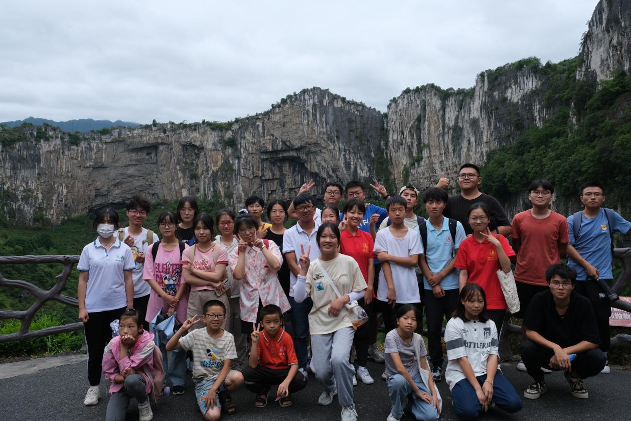实践团和部分留守儿童在石海地质公园“大漏斗”处合影