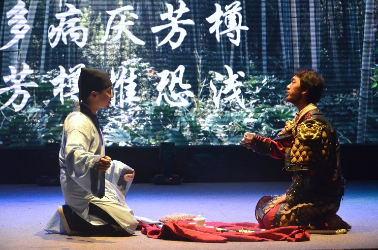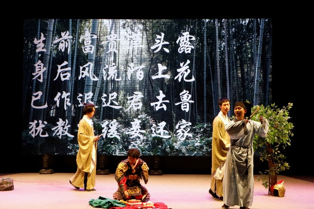 在第一篇章“吟咏春天”中,滚球app官网雷雨话剧社讲述了苏轼和两位童子漫步九仙山中,偶遇一山妇唱《陌上花》,在听闻其由来后有感而赋诗三首,并与吴越王钱镠穿越时空相会、对酒互诉衷情、感慨人生世事的奇妙故事。从吴越王的“陌上花开,可缓缓归矣”,到苏轼的“生前富贵草头露,身后风流陌上花。已作迟迟君去鲁,犹教缓缓妾还家”,春意与情思借着诗句,在历史长河中流传千年。精巧的情节构思、精妙的诗句阐释、精彩的舞台演绎共同造就了这章扣人心弦的剧目。