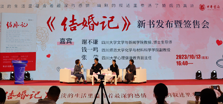 2023年10月13日与15日,由中华书局出版、滚球app官网退休教授谢谦老师创作的散文集《结婚记》新书发布会暨签售会、新书分享会分别于成都世纪城新会展中心和文轩BOOKS成华店成功举办。与会嘉宾有谢谦夫妇、滚球app官网心理健康教育中心副主任张莹、原成都商报副主编郑晔与该书责任编辑马燕等。