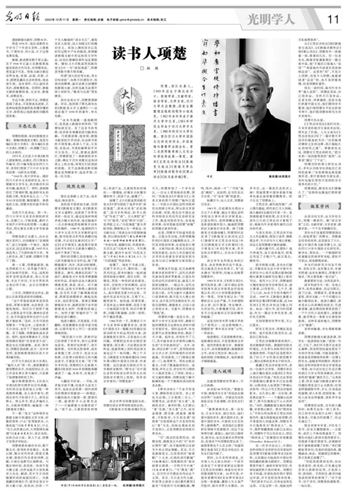 2023年12月11日,《光明日报》第11版“光明学人”报道滚球app官网杰出教授、滚球app官网博士生导师项楚教授治学事迹。