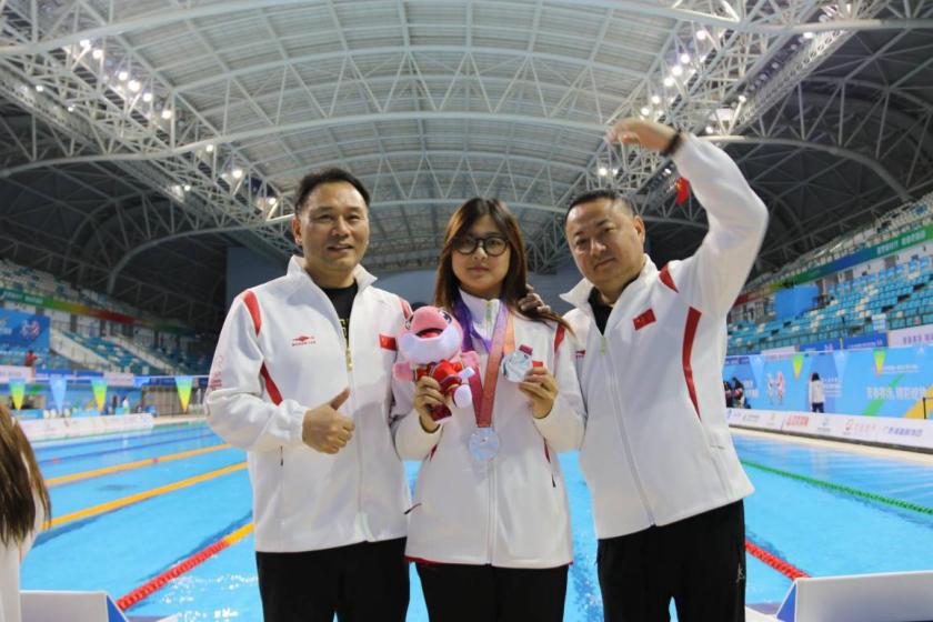 如果说赛场是队员们大放异彩的“舞台”,那么团队协作就是“后台”训练最浓墨重彩的一笔。对此,作为队长的邹佳蕾深有体会:“新进来的一些同学,对于我们学校游泳队的很多东西都还不太熟练,我们会带领他们一起练陆上、练水上。教练也会开小会,跟我们说怎么去带领新生一起融入游泳队,培养他们的责任心。因为我们还有接力的项目需要每一个人都非常努力地去训练,让大家都团结一心。”集体训练,不仅能够消弭在水下五感闭塞带来的孤独感,还能够在游泳队“拧成一股绳,卯足一股劲”的带动下,提高队员的短板项目。