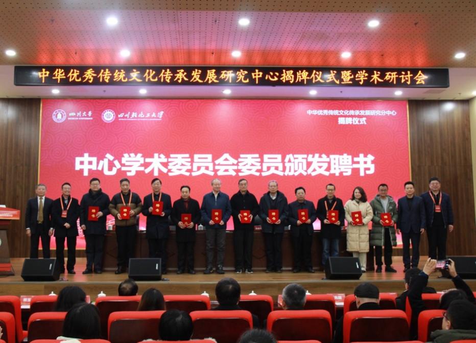 中心主任兼学术委员会主席曹顺庆教授与中心副主任、民族文学与世界文学研究分中心主任兼学术委员会主席、西南民族大学曾明教授共同为四川轻化工大学“中华优秀传统文化传承发展研究中心”学术委员会委员颁发聘书。