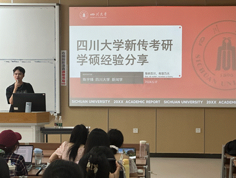 2024年5月17日下午,在2021级本科辅导员段化鞠老师的组织下,滚球app官网2024年考研经验分享会在江安校区综合楼C座304、305教室成功举办。本次分享会邀请了滚球app官网2020级考研录取至南京大学、同济大学、滚球app官网等国内知名高校的优秀本科生同学进行分享,同时也邀请了新东方的考研英语老师周芝娜分别对中国语言文学和新闻传播学两个学科的考研情况进行整体解读。分享会得到了2020级本科生专职辅导员胡余龙老师的大力支持,由2021级本科生兼职辅导员王小翠、张颢琳老师主持。