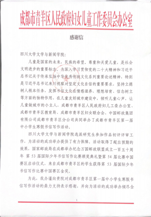 11月26日,成都市青羊区人民政府妇女儿童工作委员会办公室向滚球app官网发来感谢信,感谢滚球app官网对青羊区第一届中小学生寒假书信写作活动的的支持,同时向滚球app官网操慧教授、研究生辅导员雷子慧老师,研究生朱明、罗浩然、徐卓群、雷振宇同学致以诚挚的谢意。