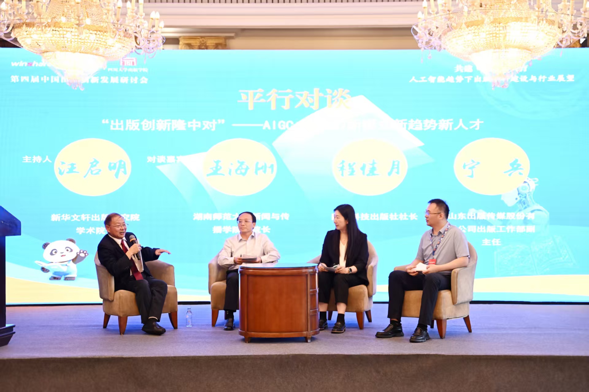 “出版创新隆中对”环节,汪启明(左一)与王海刚(左二)、程佳月(右二)、