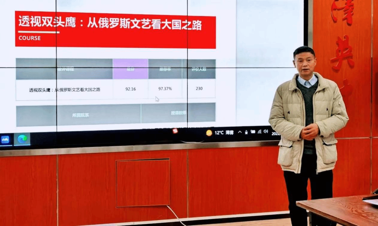 具体而言,宏观通达家国意味着每一次课程内容都关乎对俄罗斯民族的全面认识,并将俄罗斯的现代发展之路作为贯穿整个课程的主要线索;虽然每位老师的课程内容在侧重点上有所不同,但是大家组合到一起,就形成了一幅有机的拼图。而每位老师的讲述在此拼图中构筑什么样的局部,应在心中有宏观定位。中层增添形色,指的是在课堂设计,尤其是课件上下功夫,做到图文并茂,使每位老师的PPT既生动有个性,又在形式上统一起来。关于下层细叙款曲,刘亚丁教授指出,要把教师自己被作品感动之处做生动讲述,把针对文艺作品的文本分析的功夫展示出来。具体而言,就是在教学过程中加强审美教育和感性教育的强度,一方面,这体现了本课程组老师们的专业特点;另一方面,唯有如此,才能感染学生,才能深深地吸引学生。这就要做到“三观”互证,即将社会观照、历史的观照与审美观照互相印证,最终落到审美分析上,要挖掘文学艺术作品的人性,让同学们能够触摸到文本蕴含的温度。此外,刘亚丁教授还分析了同学们对本课程的评价报告。