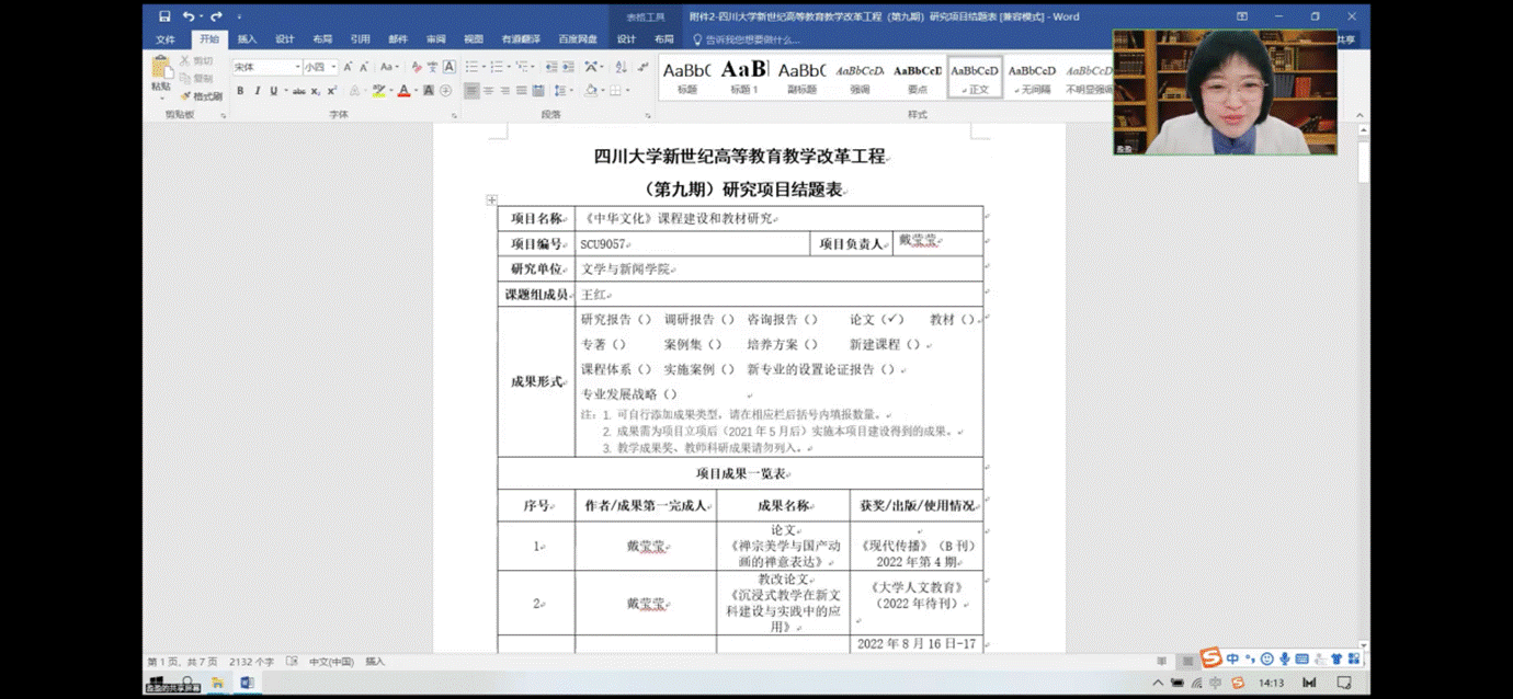 戴莹莹副研究员结合学校公共必修课程《中华文化》课程建设和教材研究,从七个具体举措落实,如多学科统观中华文化、全面推进课程思政建设,建设课程公众号“江安宵行”等落实项目建设。此外戴莹莹副研究员指出了项目在教育体验、形式、教材上的三大创新点,项目建设育人效果显著。