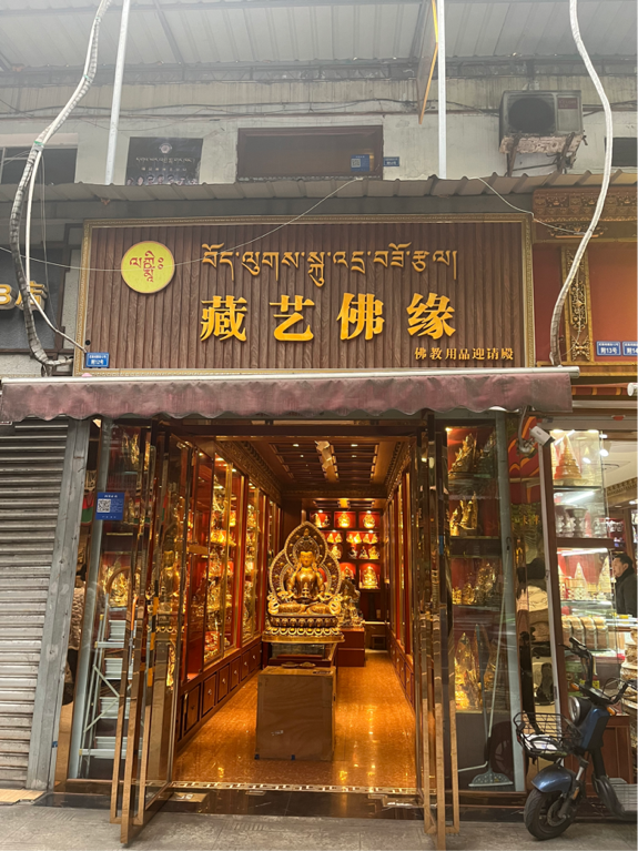 街区大部分商铺经营售卖与藏族有关的纪念品、民族用品等物件,少数经营具有基础服务能力的店铺,比如理发店、药店等。与街道民族书店经营者进行交谈,调研队了解到大部分藏族居民居住在附近小区,每晚八到九点大家会到广场跳锅庄舞,达到联络感情、坚持信仰等目的。