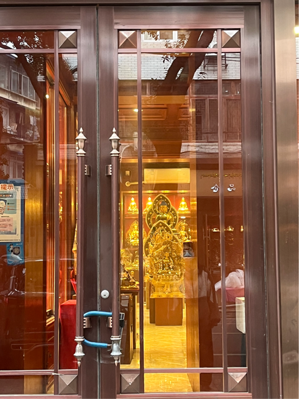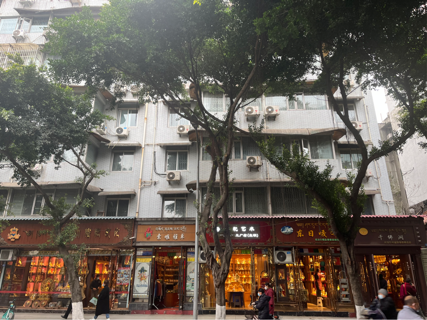 调研服务队对街区基础设施、绿化环境等进行记录分析,与其他临近区域成都本地街区进行对比,“民族用品一条街”绿化更茂密,街道两旁树木高大,两边树枝交叉形成屏障;大部分街区店铺层高较高,形成窄长形,装修风格极具藏族特色,采用木质、仿木质结构的家具,使用颜色丰富的藏族特色手工艺品进行装饰,展示柜一般从天花板一直延伸到脚底,使用烛火或者暖黄色灯光散射,营造佛教氛围。