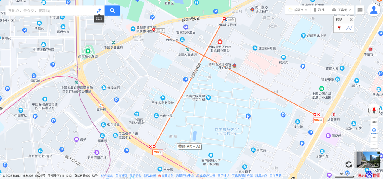 2023年1月27日上午,为具体研究街区的建筑特色与空间利用,调研队成员、建筑学专业同学周荣根据地图与实地勘测,划分藏族移居文化空间范围,包括洗面横街与武侯祠街的交汇口,东至西南民族大学校区内部,西至武侯祠大街,北至武侯祠大街中国建设银行,南至武侯祠横街藏医商城。