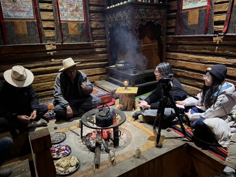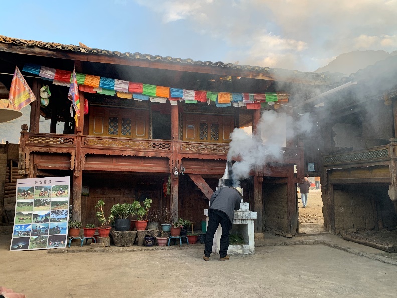2月9日在村长和马帮队长的带领下,团队成员相继来到摩梭老人的家中,就运输途中的深刻经历,情感深厚的人马关系、生死攸关的情境瞬间等问题展开了回忆与交流。通过融入当地生活与工作环境进行随机发放问卷和半结构化访谈的方式,探索性地借多维信息空间展现摩梭人的精神面貌与民俗风情。从参与者、体验者视角对摩梭马帮文化的传承过程有了新的认识。另外,当天恰逢大型宗教祈福仪式在木垮村举行,团队成员还以游客身份参观了献祭与诵经等行为,对藏传佛教喇嘛与当地摩梭村民的深刻联系有了新的体验。
