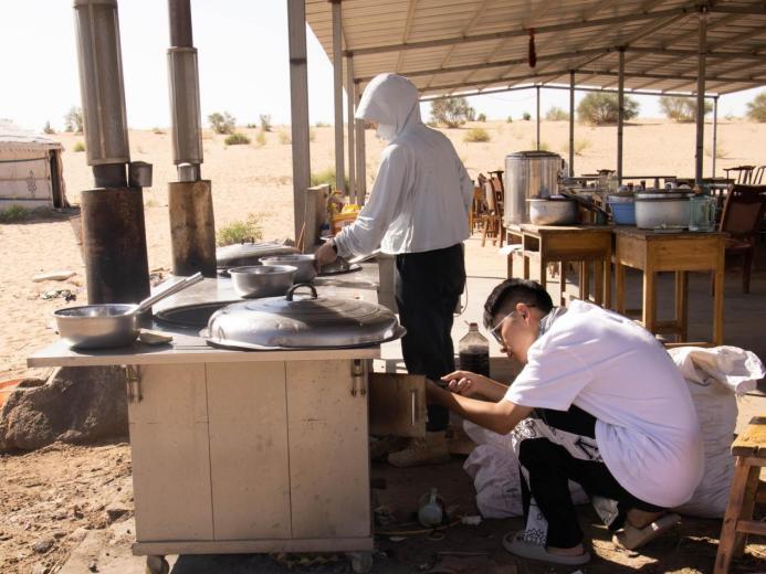 治沙队后勤组成员正在生火做饭