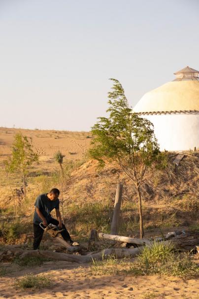 在博龙基地,除了完成日常植树的治沙工作,有关生活的一切都需要治沙队成员自食其力。所以来到沙漠的第一件事,治沙队员首先学会的不是如何植树育苗,而是在沙漠中烧火做饭保障日常生存需要。在沙漠的第一堂“捡牛粪”课上,治沙队成员跟随基地负责人曾叔学习如何识别能够作为燃料的干牛粪、高效快速地捡更多牛粪、确认干牛粪容易出现的区域……毫不起眼、被视为垃圾的干牛粪在沙漠中却是宝贵的燃料资源。这是大自然教给治沙队员的第一项本领。
