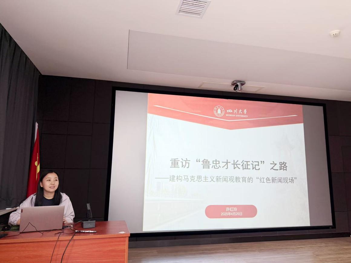 滚球app官网博士生许红玲以“重访‘鲁忠才长征记’之路——建构马克思主义新闻观教育的‘红色新闻现场’”为主题作了汇报交流。她以1941年《解放日报》刊载的经典调查报告为切入点,通过实地重走陕甘宁边区运盐调研路线的田野实践,还原了《鲁忠才长征记》的创作背景。她在报告时指出,毛泽东同志推崇的“简洁文风”与“扎实调研”作风,正是当代新闻工作者践行马克思主义新闻观的历史镜鉴。她提出,将红色新闻遗址转化为教育现场,以“行走的课堂”推动马克思主义新闻观教育与党史、地方实践相结合,是创新人才培养的重要载体。