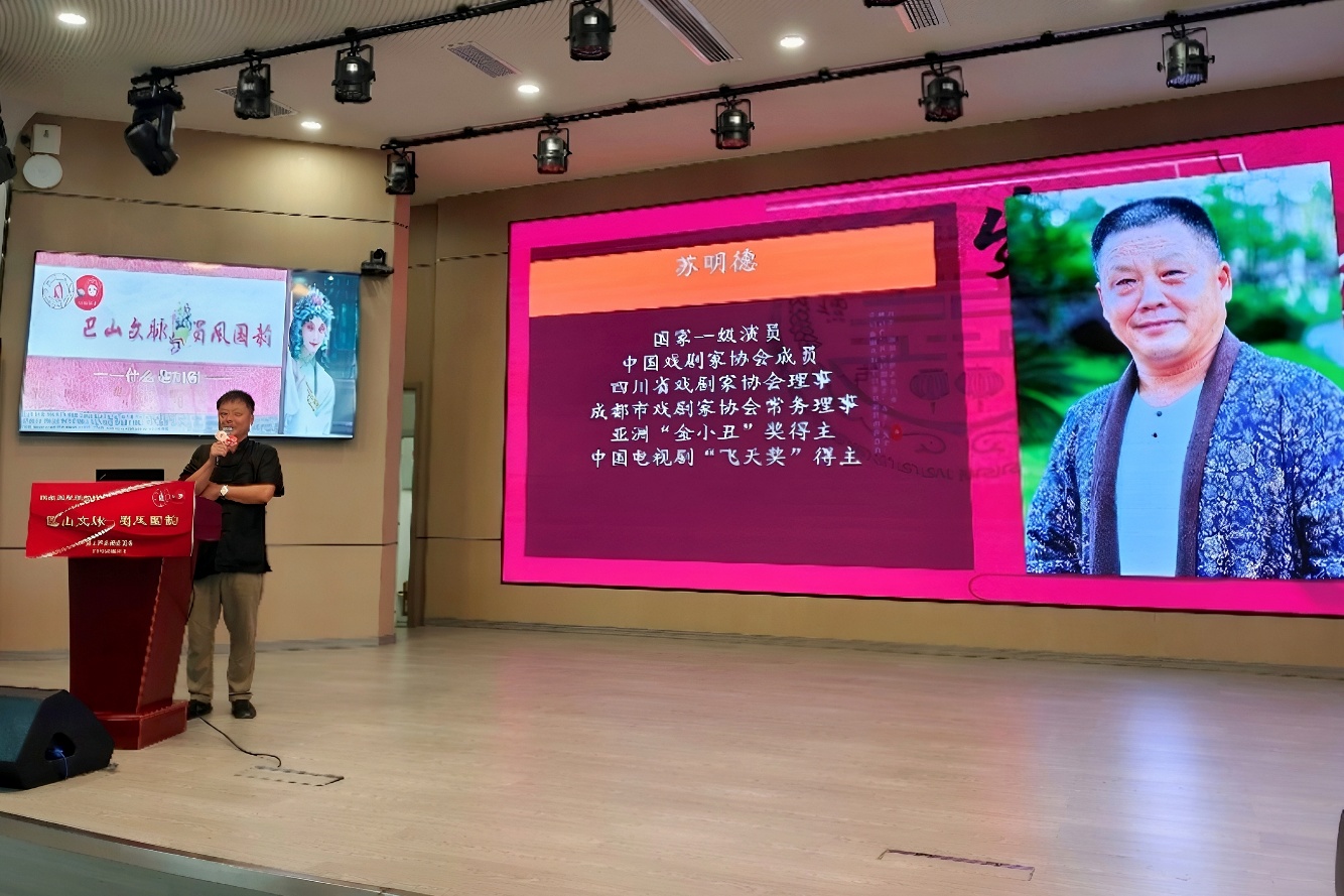 活动开始后,苏明德老师登台,他分别介绍了川剧的五个行当:生、旦、净、末、丑。他通过生动的示范和详细的解读,让观众更深入地了解了川剧的独特魅力。同时,苏老师还分享了他在四川艺术职业学院的学习经历和多年来在川剧舞台上的表演心得。他强调,川剧不仅是表演艺术,更是中华文化的重要组成部分,承载着丰富的历史和文化内涵。