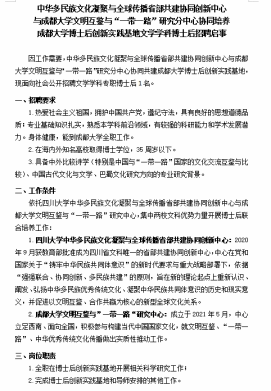 2022年12月8日,中华多民族文化凝聚与全球传播省部共建协同创新中心与成都大学文明互鉴与“一带一路”研究分中心协同共建成都大学博士后创新实践基地,并联合发布协同培养成都大学博士后创新实践基地文学学科博士后招聘启事,面向社会公开招聘文学学科专职博士后1名。