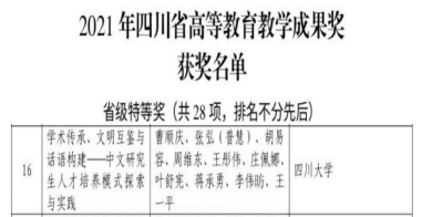 2022年4月11日,四川省人民政府正式发布《四川省人民政府关于公布2021年四川省教学成果奖的通知》,在基础教育、职业教育、高等教育3个领域共评选出特等奖60项、一等奖260项、二等奖680项。其中,中心主任曹顺庆教授牵头项目“学术传承、文明互鉴与话语构建——中文研究生人才培养模式探索与实践”荣获2021年四川省高等教育教学成果特等奖