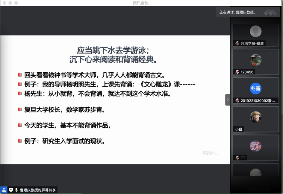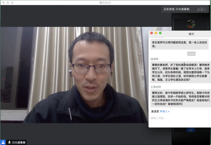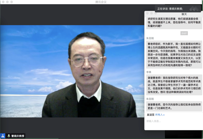 10月16日19:30,“传薪·研究生培养问题与方法系列活动”第一场在腾讯会议平台顺利举行。滚球app官网杰出教授、滚球的十大平台学术院长曹顺庆教授应邀作题为“培养研究生的几点体会”的讲座,滚球app官网副院长胡易容教授担任讲座主持人。