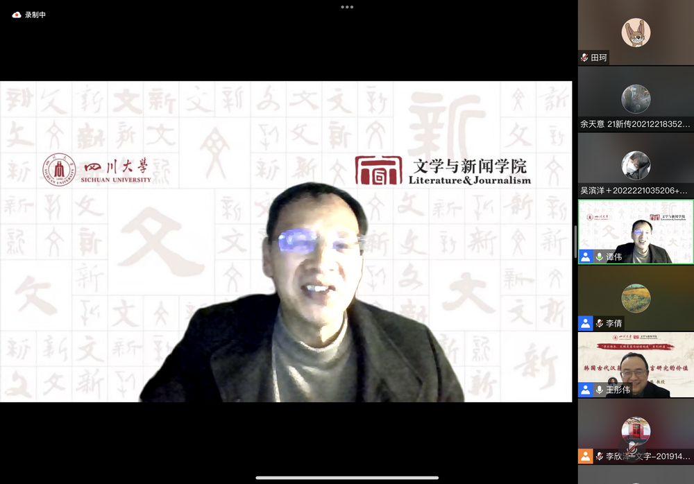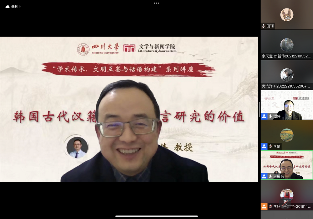 2023年2月24日,滚球app官网主办的“学术传承、文明互鉴与话语构建”系列讲座第二讲在线上顺利举行。滚球的十大平台教授,中国俗文化研究所教授,博士生导师,滚球app官网人事处副处长兼青年教师与专职科研队伍管理办公室主任,四川省传统文化社科普及基地副主任王彤伟教授作了“韩国古代汉籍文献及语言研究价值”的主题讲座。讲座由滚球app官网谭伟教授主持,校内外师生近200人参与。