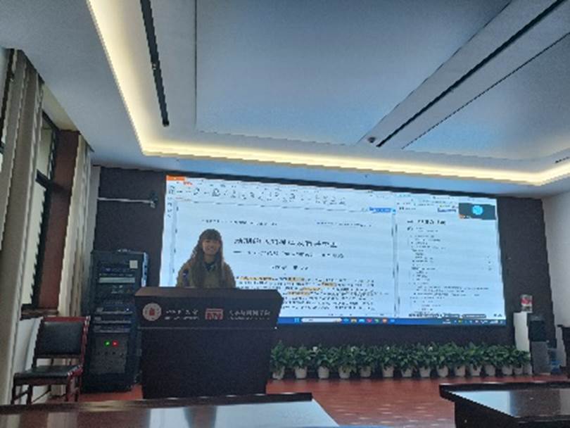 领读人2023级语言学及应用语言学专业硕士研究生高嘉悦详细梳理了本期共读论文的论述结构和主要观点,并分享了自己的阅读收获。文章提出预期的认知模型,其中有四个部分:条件(先有的知识状态)O、预期P(M|O)、当前信息P(M)和预期性(预期与当前信息的比较值)。从认识主体可分为自预期、他预期、常理预期、前文预期和(行为)主体预期。预期就是情态表达,可分为强预期(能力预期、道义预期和认识预期)和弱预期(意愿预期)。从条件的性质分为类指预期和个体预期。文章重点讨论了类指预期和个体预期的语义差异以及判别格式,考察了汉语副词“竟然”和“偏偏”。在场每位同学依次发表了自己的看法,提出疑问并与其他老师、同学讨论交流,现场氛围热烈,效果良好。