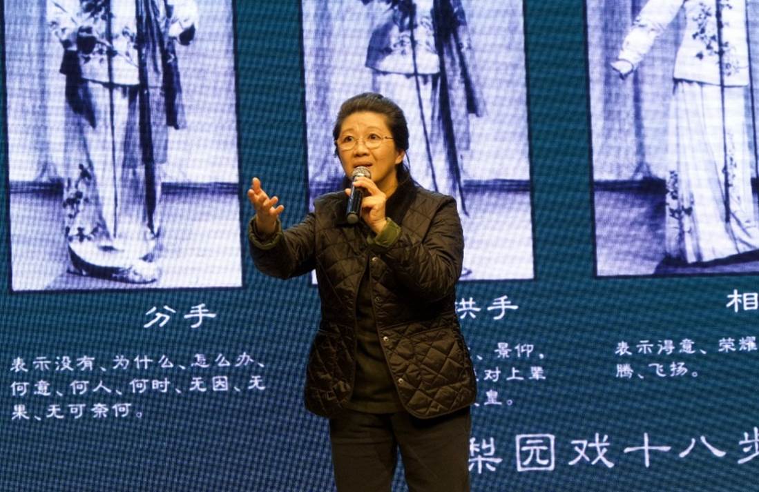 曾静萍老师与曾龙老师首先以对谈和讲故事方式,从剧目、曲牌、表演角色行当等层面讲述了泉州文化名片梨园戏的前世今生。讲到梨园戏发源于宋元时期的泉州,距今已有800年历史,2006年获批列入第一批国家级非物质文化遗产名录;广泛流播于福建泉州、漳州、厦门,广东潮汕及港澳台地区,还有东南亚各国闽南语系华侨居住地。梨园戏保存了宋元南戏的诸多剧作、唱腔和演出规制。在讲到梨园戏行当时,曾静萍老师还现场做了动作示范,强调梨园戏具备一整套程式—— “十八步科母 ”,角色行当有生、旦、净、末、丑、外、贴七个,有大梨园“上路”、“下南”和小梨园“七子班”三个流派,百余出传统剧目和传统曲牌曲谱遗存。
