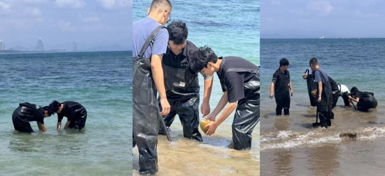 几乎每个周末包括寒暑假,队员们背着采样包奔赴海南东部海岸。在新村湾潮间带,他们跪在滩涂上用标尺测量海草密度,趴在礁石间拍摄植被分布,累计划定1.5m×1.5m样方120个,徒步踏查海岸线超50公里。“第一次采样时被贝壳划破手,但看到GPS记录下的退化区域图,就觉得伤口值得。”大二学生王雨鑫翻开磨损的笔记本,里面贴满不同时期的海草叶片标本—2024年5月,新村湾海草密度为120株/㎡,到2024年12月已降至45株/㎡,物种从8种减少至3种。团队还在退潮间隙采集海水与底质样本200余份,用pH试纸、溶解氧仪等简易设备完成基础检测,发现陆源污染与渔业活动是导致海草退化的主因。
