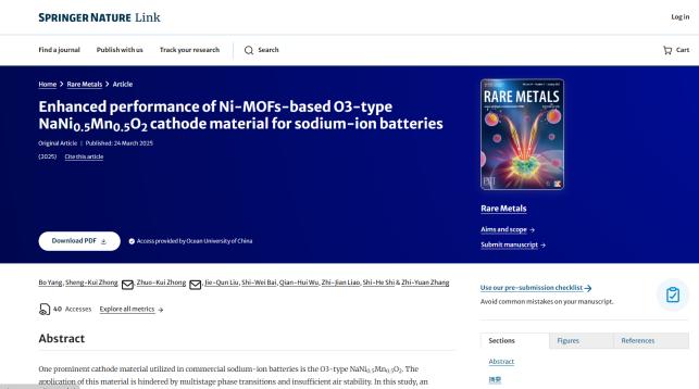 近日,beat365官网2022级资源与环境硕士研究生杨波同学,以第一作者在环境材料领域一区、TOP期刊Rare Metals(IF:9.6)发表题为“Enhanced performance of Ni-MOFs-based O3-type NaNi0.5Mn0.5O2 cathode material for sodium-ion batteries”的研究论文。钟胜奎教授为文章通讯作者。
