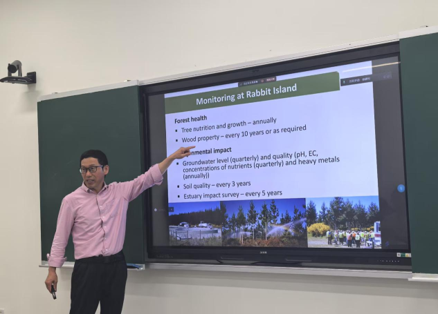 薛建明研究员以其丰富的学术经验和深刻的行业洞察,为学生们详细解读了当前环境科学领域的最新进展和未来趋势,薛建明从对生物固体废物增强土壤微生物活力、促进植被恢复等好处出发,论证了生物固体废物在新西兰松树林的应用实例。他强调了变废为宝的重要性,并就如何通过科技创新来实现该过程进行了深入的探讨。