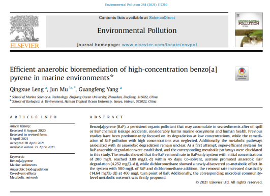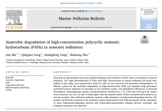 近来,beat365唯一官方网站教授穆军团队在海洋溢油沉积物中多环芳烃的生物修复方面取得一系列重要进展,以我校为唯一通讯单位,先后在《Environmental Pollution》上发表《海洋环境中高浓度苯并芘的高效厌氧生物修复》;在《Marine Pollution Bulletin》上发表《海水沉积物中高浓度多环芳烃的厌氧降解》成果。